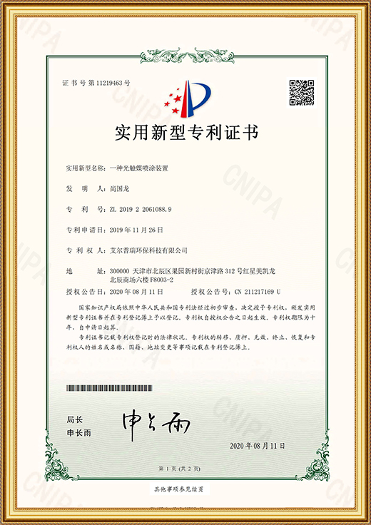 • 實用新型專利證書(一種光觸媒噴涂裝置)